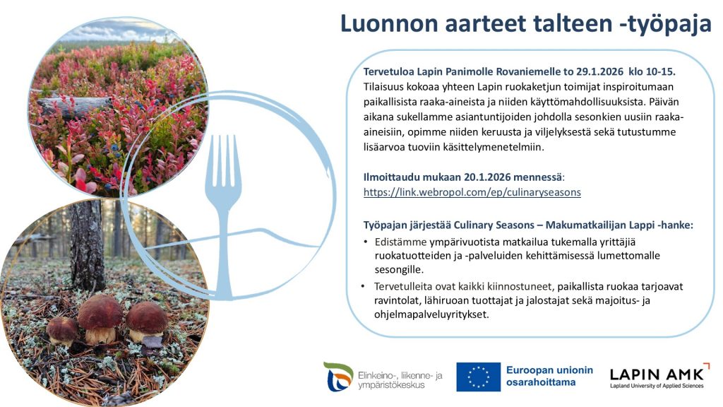 Työpaja on osa Culinary Seasons -hankkeen Master Class -kokonaisuutta. Tapahtuman tullessa täyteen Master Class – osallistujat ovat etusijalla.